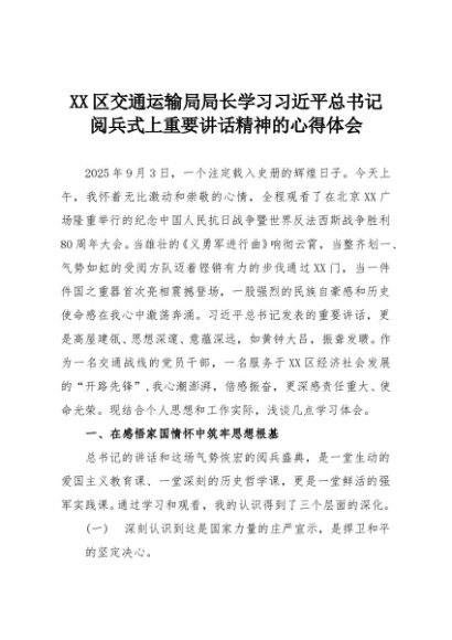【七哥公文】2025年:XX区交通运输局局长学习习近平总书记阅兵式上重要讲话精神的心得体会+更多免费公文+VX:QiGeGongWen2024