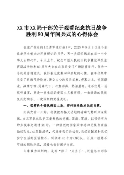 【七哥公文】2025年:XX市XX局干部关于观看纪念抗日战争胜利80周年阅兵式的心得体会+更多免费公文+VX:QiGeGongWen2024
