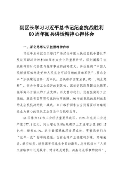 【七哥公文】2025年:副区长学习习近平总书记纪念抗战胜利80周年阅兵讲话精神心得体会+更多免费公文+VX:QiGeGongWen2024