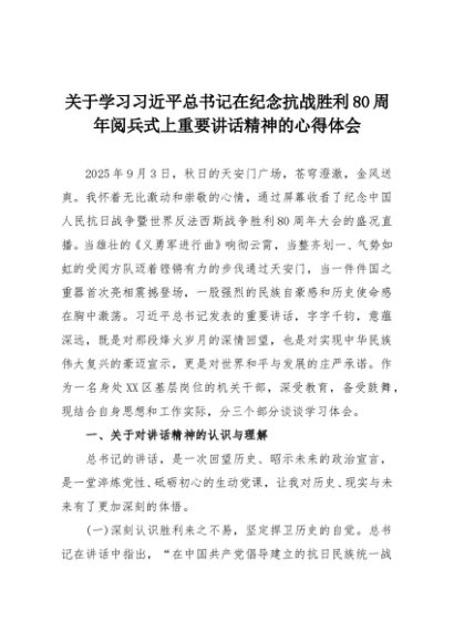 【七哥公文】2025年:关于学习习近平总书记在纪念抗战胜利80周年阅兵式上重要讲话精神的心得体会+更多免费公文+VX:QiGeGongWen2024