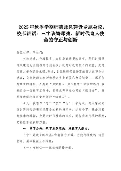 【七哥公文】2025年:2025年秋季学期师德师风建设专题会议,校长讲话:三字诀铸师魂,新时代育人使命的守正与创新+更多免费公文+VX:QiGeGongWen2024