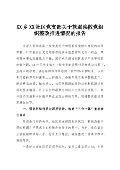 【七哥公文】2025年:XX乡XX社区党支部关于软弱涣散党组织整改推进情况的报告+更多免费公文+VX:QiGeGongWen2024