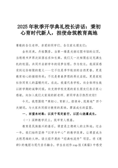【七哥公文】2025年:2025年秋季开学典礼校长讲话:秉初心育时代新人,担使命筑教育高地+更多免费公文+VX:QiGeGongWen2024