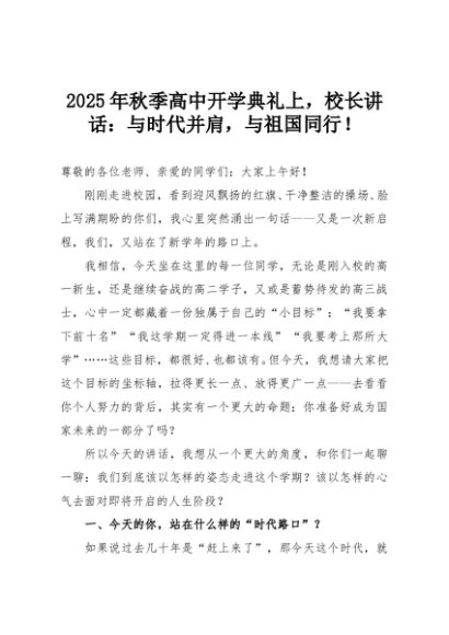 【七哥公文】2025年:2025年秋季高中开学典礼上,校长讲话:与时代并肩,与祖国同行!+更多免费公文+VX:QiGeGongWen2024