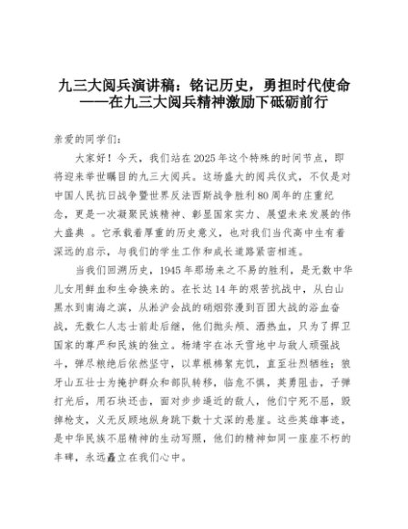 【七哥公文】2025年:九三大阅兵演讲稿:铭记历史,勇担时代使命——在九三大阅兵精神激励下砥砺前行+更多免费公文+VX:QiGeGongWen2024