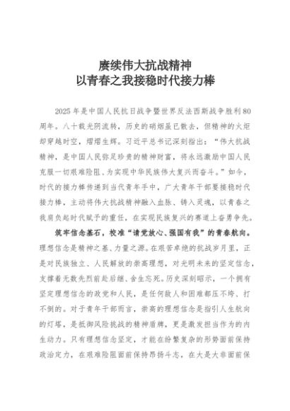 / 【七哥公文】2025年:赓续伟大抗战精神以青春之我接稳时代接力棒+更多免费公文+VX:QiGeGongWen2024