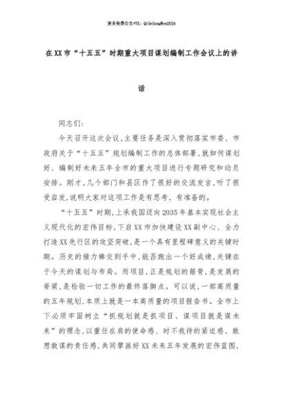【七哥公文】2025年:在XX市“十五五”时期重大项目谋划编制工作会议上的讲话+更多免费公文+VX:QiGeGongWen2024