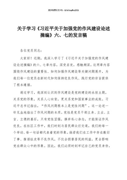 【七哥公文】2025年:关于学习《习近平关于加强党的作风建设论述摘编》六、七的发言稿+更多免费公文+VX:QiGeGongWen2024