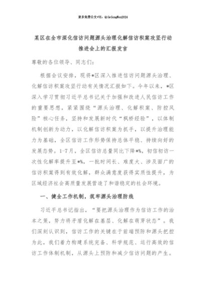 【七哥公文】2025年:某区在全市深化信访问题源头治理化解信访积案攻坚行动推进会上的汇报发言+更多免费公文+VX:QiGeGongWen2024