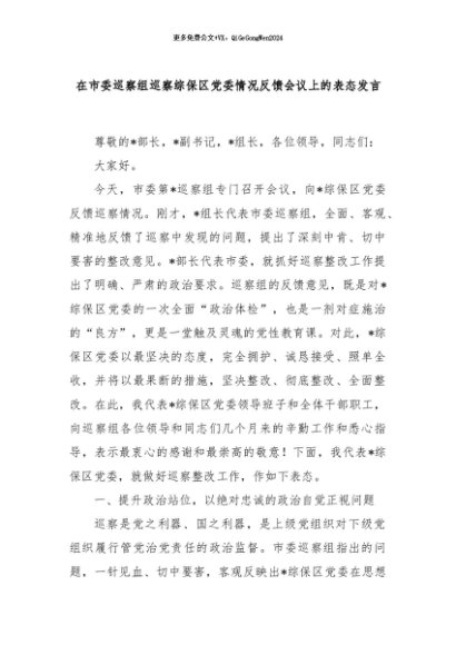 【七哥公文】2025年:在市委巡察组巡察综保区党委情况反馈会议上的表态发言+更多免费公文+VX:QiGeGongWen2024