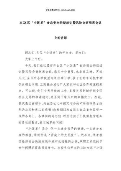 【七哥公文】2025年:在XX区“小饭桌”食品安全约谈培训暨风险会商联席会议上的讲话+更多免费公文+VX:QiGeGongWen2024