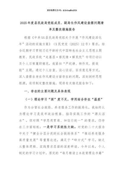 【七哥公文】2025年:2025年度县民政局党组成员、副局长作风建设查摆问题清单及整改措施报告+更多免费公文+VX:QiGeGongWen2024