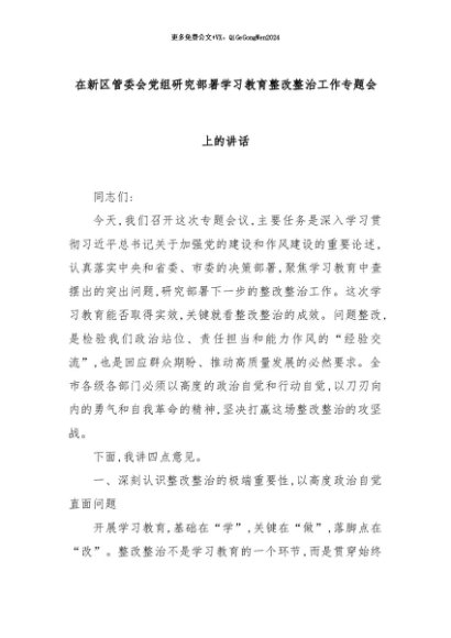 【七哥公文】2025年:在新区管委会党组研究部署学习教育整改整治工作专题会上的讲话+更多免费公文+VX:QiGeGongWen2024