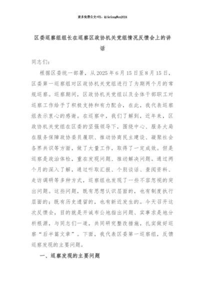 【七哥公文】2025年:区委巡察组组长在巡察区政协机关党组情况反馈会上的讲话+更多免费公文+VX:QiGeGongWen2024
