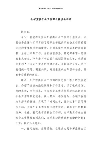 【七哥公文】2025年:全省党委社会工作部长座谈会讲话+更多免费公文+VX:QiGeGongWen2024