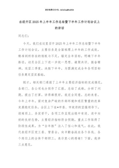 【七哥公文】2025年:在经开区2025年上半年工作总结暨下半年工作计划会议上的讲话+更多免费公文+VX:QiGeGongWen2024