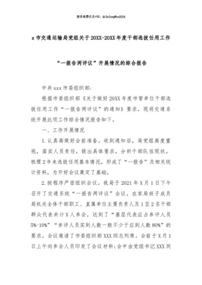 【七哥公文】2025年:x市交通运输局党组关于20XX-20XX年度干部选拔任用工作“一报告两评议”开展情况的综合报告+更多免费公文+VX:QiGeGongWen2024