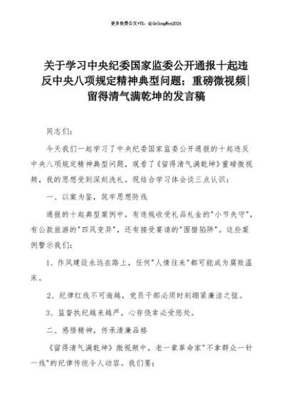 【七哥公文】2025年:关于学习中央纪委国家监委公开通报十起违反中央八项规定精神典型问题;重磅微视频留得清气满乾坤的发言稿+更多免费公文+VX:QiGeGongWen2024