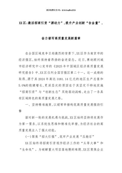 【七哥公文】2025年:XX区:激活招商引资“源动力”,提升产业创新“含金量”,奋力谱写高质量发展新篇章+更多免费公文+VX:QiGeGongWen2024