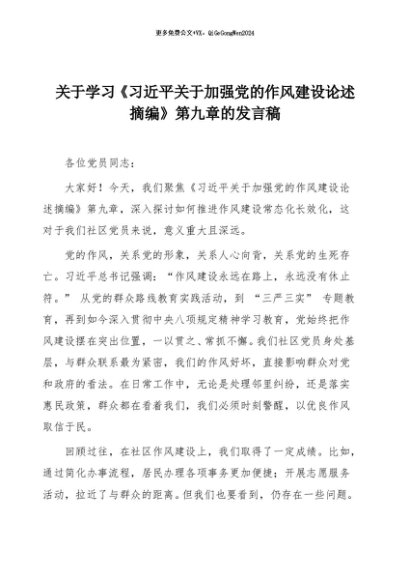【七哥公文】2025年:关于学习《习近平关于加强党的作风建设论述摘编》第九章的发言稿+更多免费公文+VX:QiGeGongWen2024