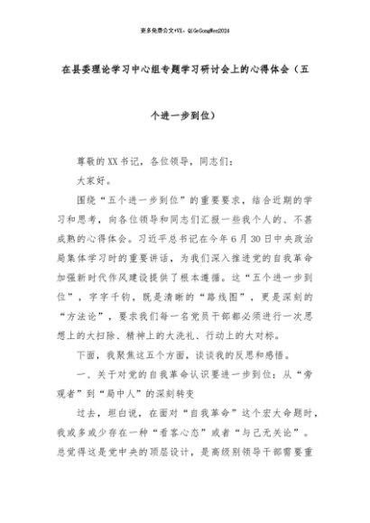 【七哥公文】2025年:在县委理论学习中心组专题学习研讨会上的心得体会(五个进一步到位)+更多免费公文+VX:QiGeGongWen2024