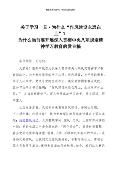 【七哥公文】2025年:关于学习一见·为什么“作风建设永远在”?为什么当前要开展深入贯彻中央八项规定精神学习教育的发言稿+更多免费公文+VX:QiGeGongWen2024