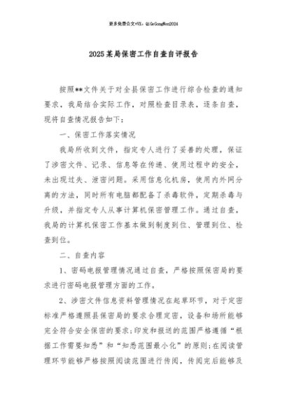 【七哥公文】2025年:2025某局保密工作自查自评报告+更多免费公文+VX:QiGeGongWen2024