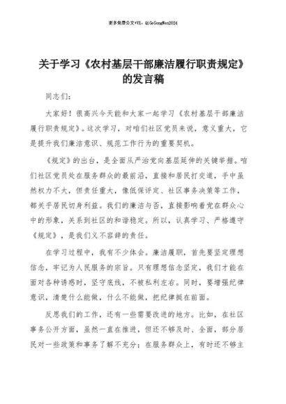 / 【七哥公文】2025年:学习《农村基层干部廉洁履行职责规定》的发言稿+更多免费公文+VX:QiGeGongWen2024