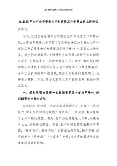 【七哥公文】2025年:在2025年全市全市安全生产和信访工作专题会议上的讲话+更多免费公文+VX:QiGeGongWen2024
