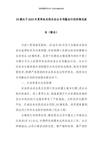 【七哥公文】2025年:XX镇关于2025年夏季食品药品安全专项整治行动的情况报告(精品)+更多免费公文+VX:QiGeGongWen2024