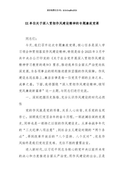 / 【七哥公文】2025年:XX单位关于深入贯彻作风建设精神的专题廉政党课+更多免费公文+VX:QiGeGongWen2024