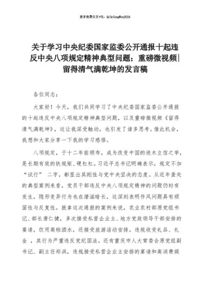 【七哥公文】2025年:关于学习中央纪委国家监委公开通报十起违反中央八项规定精神典型问题;重磅微视频留得清气满乾坤的发言稿2+更多免费公文+VX:QiGeGongWen2024