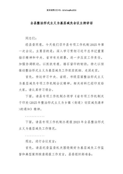/ 【七哥公文】2025年:全县整治形式主义为基层减负会议主持讲话+更多免费公文+VX:QiGeGongWen2024