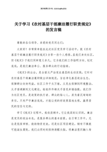 【七哥公文】2025年:关于学习《农村基层干部廉洁履行职责规定》的发言稿+更多免费公文+VX:QiGeGongWen2024