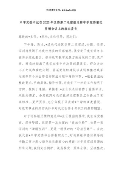 【七哥公文】2025年:中学党委书记在2025年区委第二巡察组巡察中学党委情况反馈会议上的表态发言+更多免费公文+VX:QiGeGongWen2024