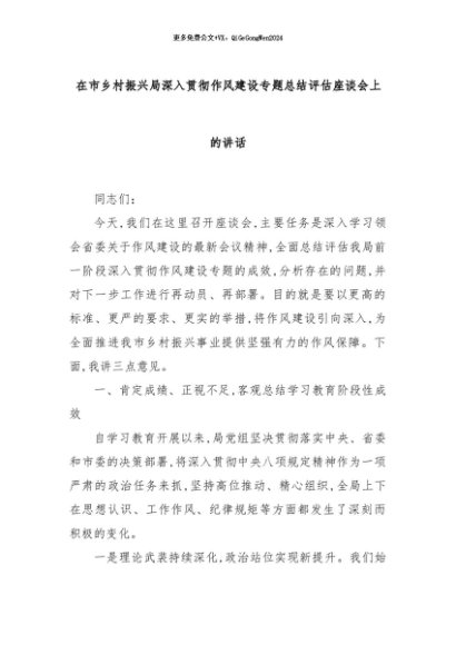 【七哥公文】2025年:在市乡村振兴局深入贯彻作风建设专题总结评估座谈会上的讲话+更多免费公文+VX:QiGeGongWen2024
