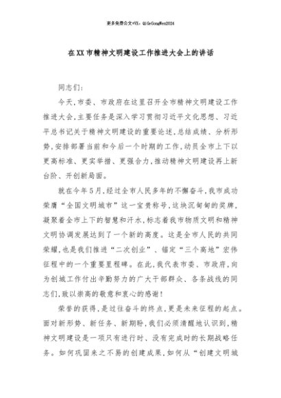 【七哥公文】2025年:在XX市精神文明建设工作推进大会上的讲话+更多免费公文+VX:QiGeGongWen2024