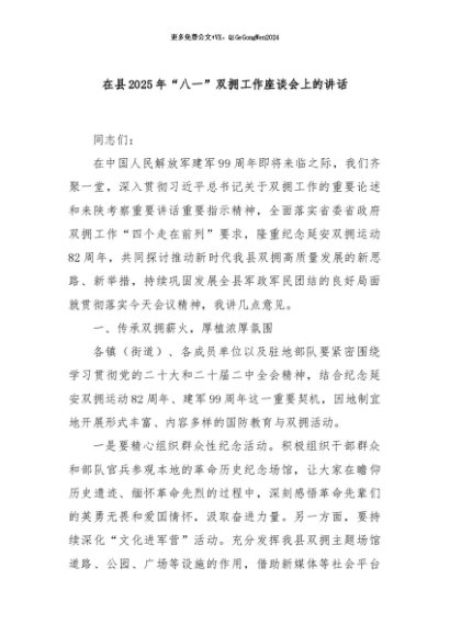 / 【七哥公文】2025年:在县2025年“八一”双拥工作座谈会上的讲话+更多免费公文+VX:QiGeGongWen2024