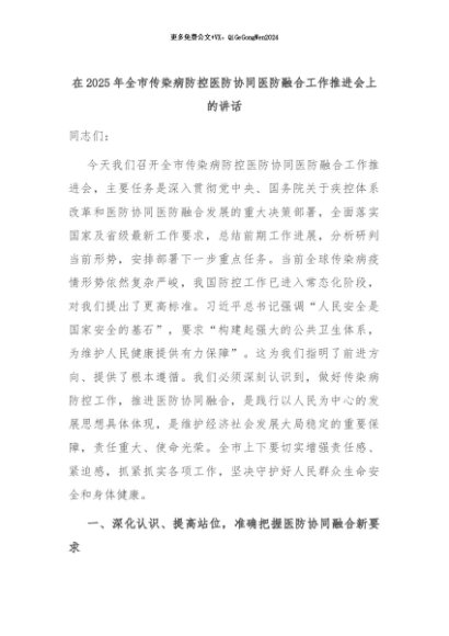 【七哥公文】2025年:在2025年全市传染病防控医防协同医防融合工作推进会上的讲话+更多免费公文+VX:QiGeGongWen2024