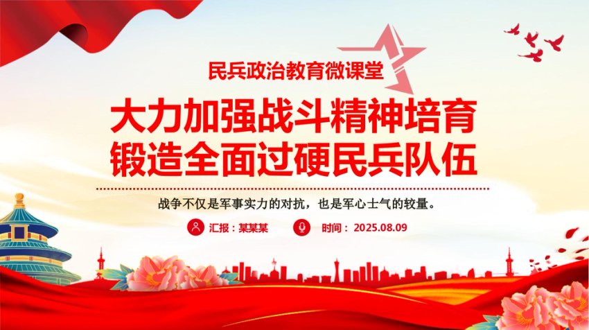 【七哥公文】2025年:党课PPT:大力加强战斗精神培育锻造全面过硬民兵队伍+更多免费公文+VX:QiGeGongWen2024