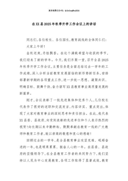 / 【七哥公文】2025年:在XX县2025年秋季开学工作会议上的讲话+更多免费公文+VX:QiGeGongWen2024