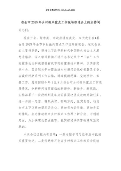 【七哥公文】2025年:在全市2025年乡村振兴重点工作现场推进会上的主持词+更多免费公文+VX:QiGeGongWen2024