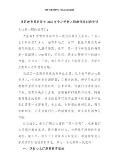 【七哥公文】2025年:某区教育局副局长2025年中小学新入职教师培训班讲话+更多免费公文+VX:QiGeGongWen2024