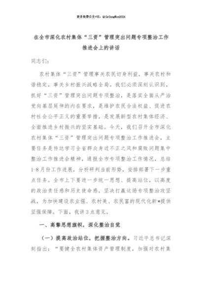 【七哥公文】2025年:在全市深化农村集体“三资”管理突出问题专项整治工作推进会上的讲话+更多免费公文+VX:QiGeGongWen2024
