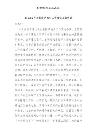 / 【七哥公文】2025年:在2025年全县防汛减灾工作会议上的讲话+更多免费公文+VX:QiGeGongWen2024