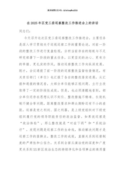 / 【七哥公文】2025年:在2025年区党工委巡察整改工作推进会上的讲话+更多免费公文+VX:QiGeGongWen2024