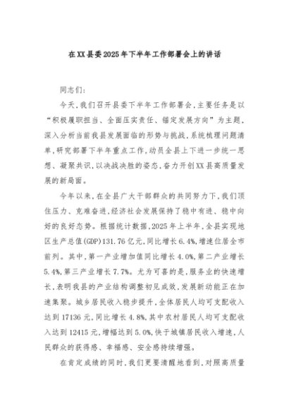 / 【七哥公文】2025年:在XX县委2025年下半年工作部署会上的讲话+更多免费公文+VX:QiGeGongWen2024