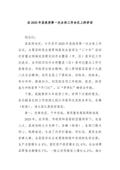 / 【七哥公文】2025年:在2025年县政府第一次全体工作会议上的讲话+更多免费公文+VX:QiGeGongWen2024