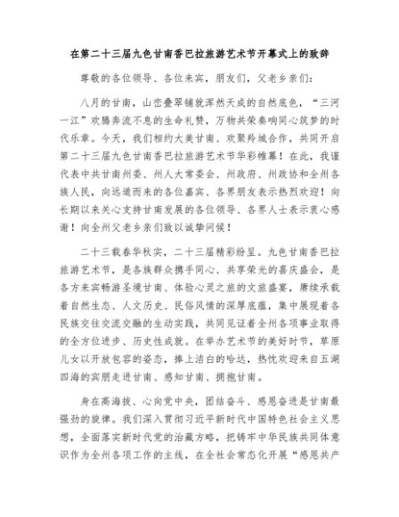 【七哥公文】2025年:在第二十三届九色甘南香巴拉旅游艺术节开幕式上的致辞+更多免费公文+VX:QiGeGongWen2024