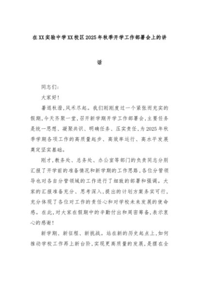 【七哥公文】2025年:在XX实验中学XX校区2025年秋季开学工作部署会上的讲话+更多免费公文+VX:QiGeGongWen2024